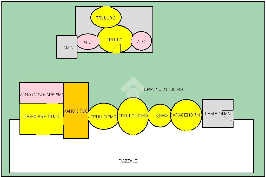 Il complesso è composto da trulli, lamie e casolari, tutti da ristrutturare, ma con un potenziale straordinario grazie alle loro disposizioni e alle caratteristiche uniche. La zona, facilmente accessibile e circondata da altre strutture storiche già restaurate, si distingue per il suo alto valore paesaggistico e architettonico, rendendo l'area particolarmente interessante e di pregio.