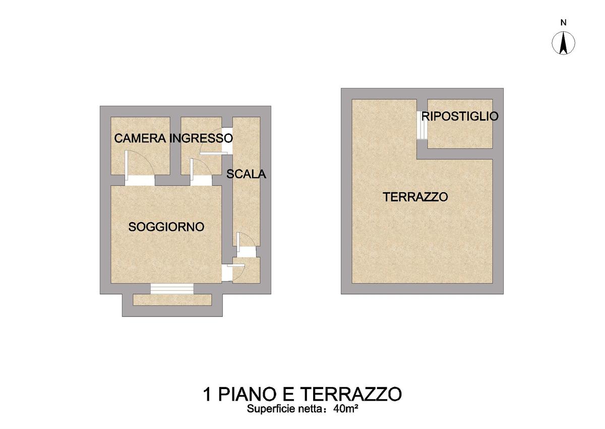 Il primo piano si apre invece su un vano d’ingresso che conduce a un luminoso soggiorno con affaccio su balcone, una camera da letto e un bagno. Proseguendo, una scala accompagna al secondo livello, dove troviamo un pratico ripostiglio e una terrazza, perfetta da trasformare in uno spazio esclusivo all’aperto.